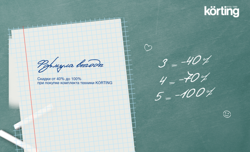 В период с 1 августа по 30 сентября 2022 года компания Korting продлевает супер акцию - Формула выгоды!Условия акции:
