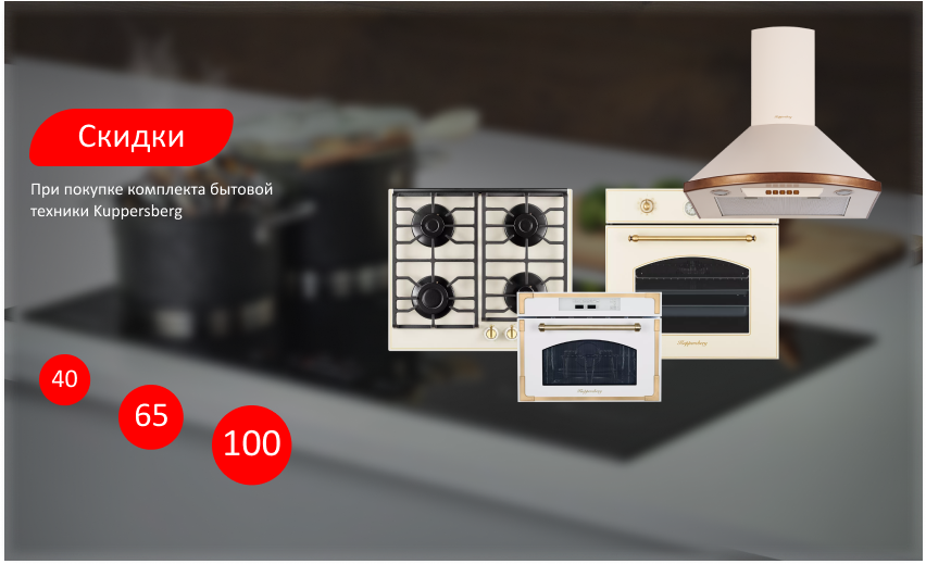 В период с 5 сентября по 11 ноября 2022 года компания Kuppersberg объявляет акцию "Скидки 40/65/100%"!Условия акции: