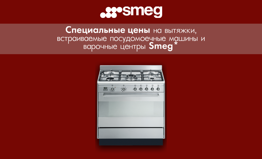 В период с 10 января по 28 февраля 2023 года Smeg объявляет акцию "Специальное предложение"!На вытяжки, посудомоечные машины и варочные центры действует скидка 20%.